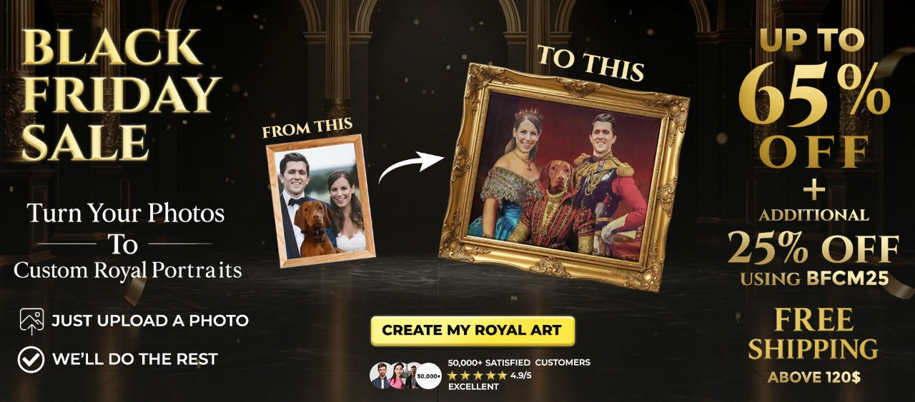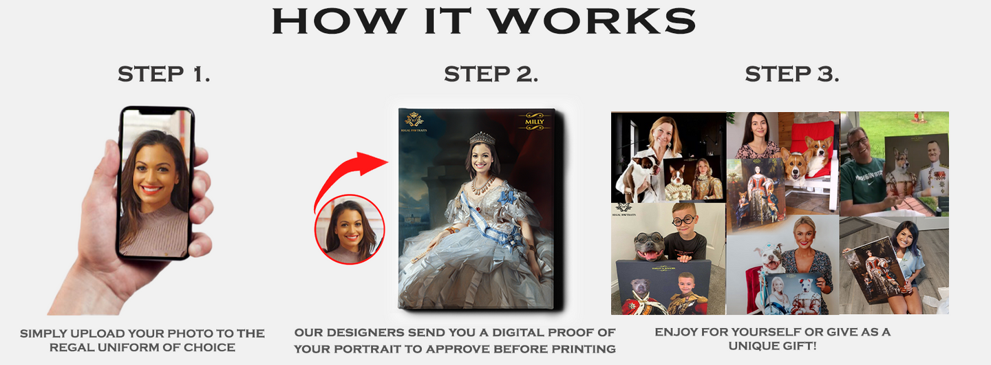 Create yourself, a friend, or a family member a unique and timeless gift. We’ll create a lifelike Renaissance-style royal portrait, based on a photo you upload to our site.